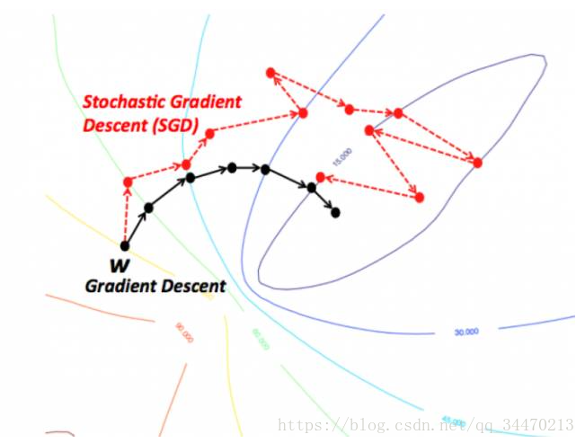 随机梯度下降的想法就是每次在Delta f_i 中随机选取一个计算代替上面的Delta f_i,以这个随机选取的方向作为下降的方向。这样的方法反而比梯度下降能够更快地到达(局部)最优解。