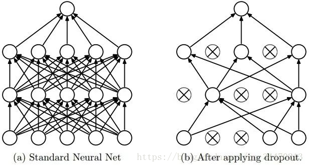 Dropout 可以很好地解决这个问题。Dropout说的简单一点就是在前向传导的时候,让某个神经元的激活值以一定的概率p停止工作,示意图如下: