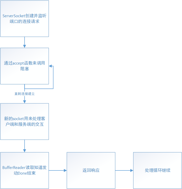 这种的特点是每次只能处理一个请求,如果要实现多个请求并行,就还要分配一个新的线程来给每个客户端的socket''