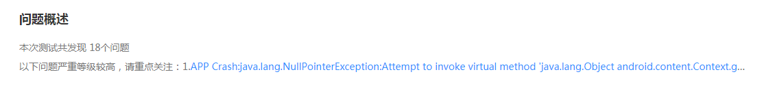 3. 问题概述:本次测试总共发现问题次数,问题概述会重点显示用户最需要关注的问题,一般是严重级别和致命级别的问题。