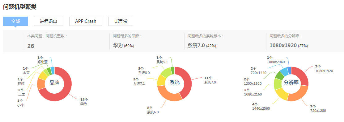 5. 问题机型聚类:问题机型聚类这部分旨在帮助用户高效定位问题发生的规律和原因。报告将某一特定问题如UI异常、App Crash,按品牌、系统、分辨率三个维度进行聚类分析,帮助用户就某一特定问题进行机型锁定。