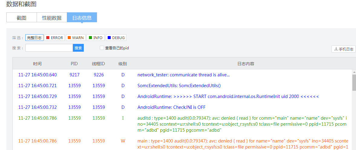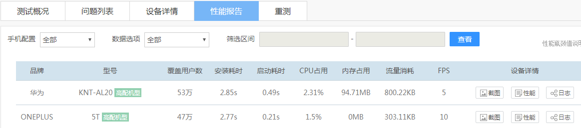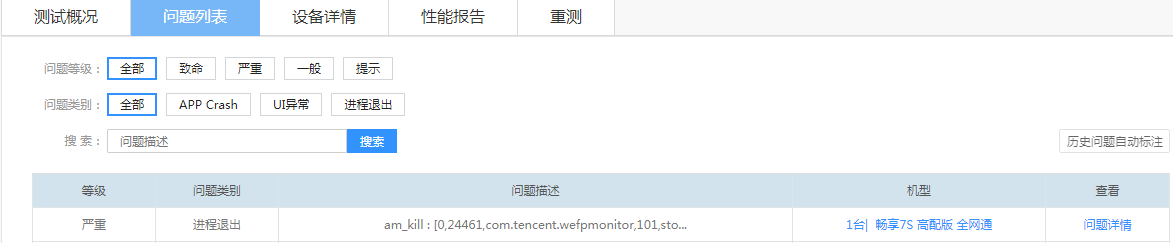 右侧查看一栏可以跳转到相应设备的测试详情页面,包含本次测试设备的问题原因、问题现场、截图、日志信息和性能数据。