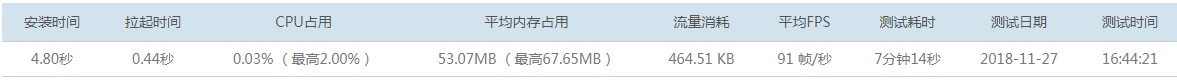 测试数据包括安装时间、拉起时间、cpu占用、平均内存占用、流量消耗、平均FPS、测试耗时情况。