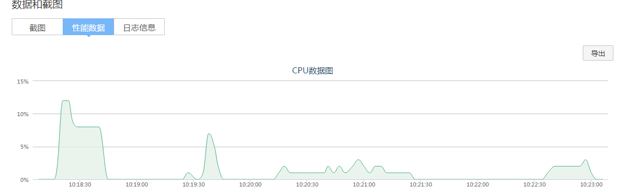 性能数据包括测试中实时CPU数据、内存、流量、FPS数据情况。