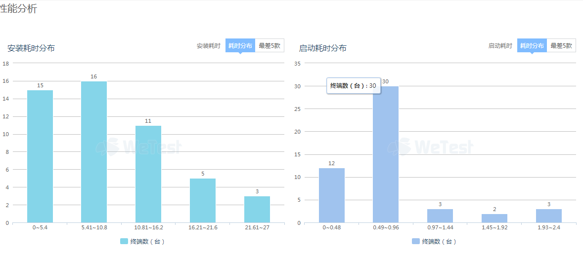 性能总览包括:安装耗时分布、启动耗时分布、平均内存分布占用、内存峰值占用、流量消耗分布情况。