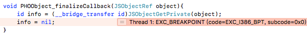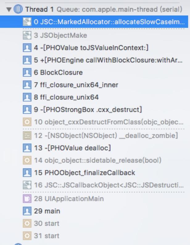 从调用堆栈来看,每次崩溃都发生在JSObjectMake之后,这是不是意味着垃圾回收时不能进行JSObjectMake操作呢?为了验证这个问题,我们在PHOObject_finalizeCallback函数中不做任何对象释放操作,仅仅执行一次JSObjectMake,
