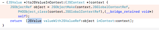 1)、toJSValueInContext:方法是通过JSObjectMake 再生成一个JSValue。如上图中,最终返回的是一个JSValue,并且这个JSValue对self(PHOValue类型)做了一次强引用。