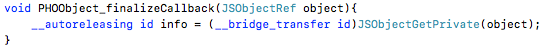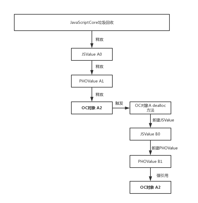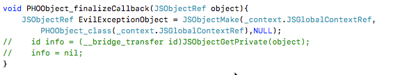 2)、PHOObject_finalizeCallback 是JSValue的析构函数,当通过JSObjectMake生成的JS对象在释放时会调用该函数。在这个函数中,我们释放了之前所强引用的self(PHOValue类型)。当self释放时,self所强持有的对象A会被释放。进一步执行A的dealloc方法中,在dealloc方法中,我们再次调用了JSObjectMake函数生成其他的对象,并再次强持有了A对象,并将JSValue传入到JS中进行其他方法调用(如果不理解这个问题,请参考JSPatch对重写dealloc方法的处理,但是不同的是JSPatch 并不依赖垃圾回收)。