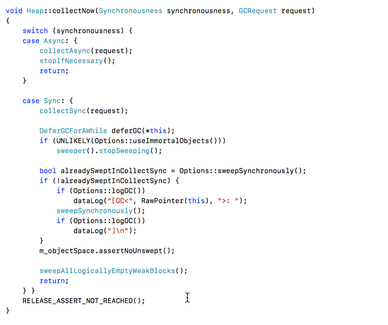 这样的改动就意味着,只要处于JavaScriptCore进行垃圾回收,就会立刻调用JSObjectMake。经过验证发现,果然在此处发生崩溃,并且是百分百复现,调用堆栈基本一致。因此可以说明我们的猜想是正确的。仔细想想这个问题,有经验的同学可能会感到细思极恐,因为垃圾回收机制并不受我们控制,我们在进行JSObjectMake无法保证一定不处于垃圾回收期间,那么理论上来说应该进行发生崩溃才对,为什么这个问题之前一直没有暴露出来呢?我们循环100000次创建对象并不断通过safari的调试功能人工触发垃圾回收,并没有发生崩溃。JavascriptCore存在两种垃圾回收方式,一种是同步回收,一种是异步回收,无论哪种方式,JavascriptCore对虚拟机有共有的堆(Heap,JavascriptCore的垃圾回收处理都在Heap.cpp中)都进行了加锁处理,换句话说就是在正常情况下JSObjectMake在垃圾回收时是无法访问堆的。