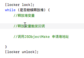 那么现在问题来了,我们既然知道了回调方法,那么如何获得回调呢?在OC层面,我们可以通过runtime 进行hook,甚至在C语言层面我们也可以通过fb的fishhook来实现hook,在C++层面我们如何hook一个带命名空间的函数呢?(这个问题我们并没有实现思路,如果有人知道在iOS中如何hook一个C++函数,请及时留言指教)。在经历了一系列尝试后,我们放弃了hook C++函数的方法,转而寻求其他方法。回到最初的目的,实际上我们就是想保证垃圾回收之后再执行我们的JSObjectMake。因此GCD的延迟操作是一个很好的思路,但是到底延迟多长时间呢?这个方案似乎不是那么完美。那么还有什么操作是一个延迟释放的操作呢?__autoreleasing 应该是一个比较好的选择。当对象前被添加__autoreleasing修饰时,这个对象会被延迟到自动释放池释放时才被释放。当自动释放池释放时当前runloop一定是结束了,也就是说该垃圾回收一定是结束了(不可能一次垃圾回收分为两个runloop)。因此只需要将代码改为如下所图11示即可