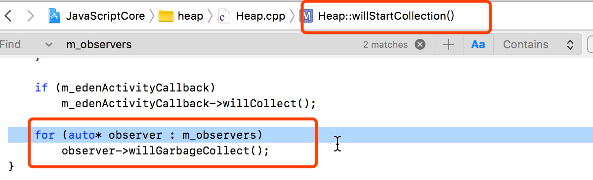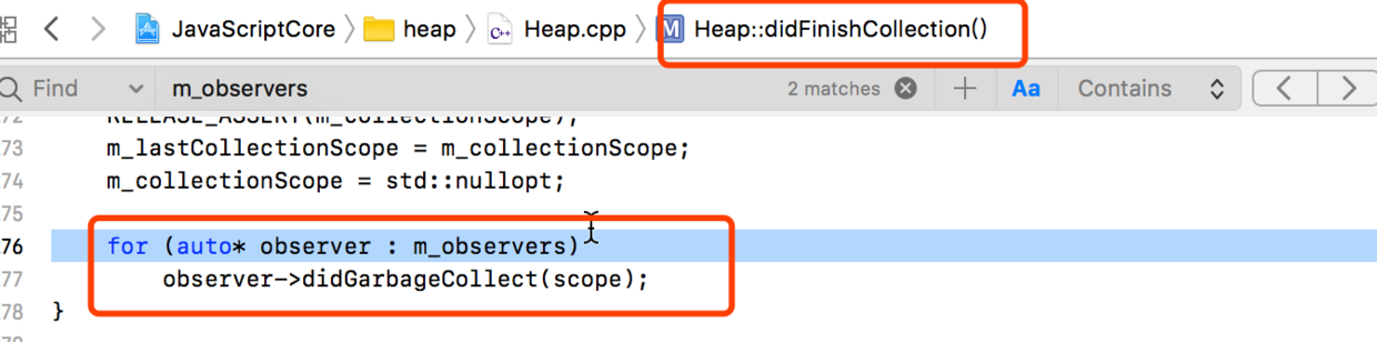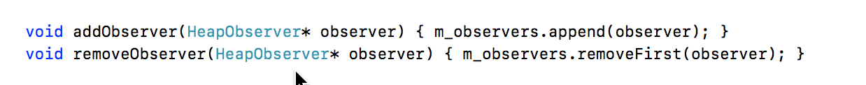 既然基本定位到了问题的原因,那么下一步就要找方法去解决这个问题。问题的根源在于我们想在JS变量释放的时候释放它所间接持有的OC对象,如果在垃圾回收期间我们无法进行释放,那么是不是意味着只要我们获取到JavascriptCore的垃圾回收开始和结束回调就能避免这个问题了呢?查找JavascriptCore后发现,还真的有这个回调状态,只不过接口并没有对我们开放,Heap.h中存在一个添加观察者的接口。
