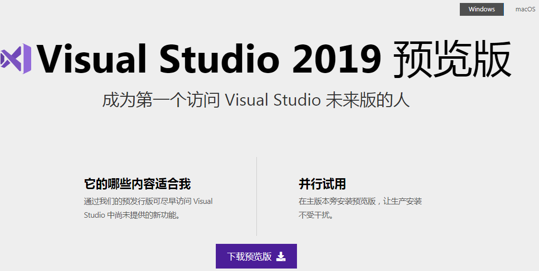 安装Visual Studio 2019 Preview,要安装Visual Studio 2019预览,请访问 Visual Studio 2019 Preview。 别担心。 Visual Studio和Visual Studio“预览”可以并排安装在同一设备上。 它对您当前稳定的VS安装没有影响。