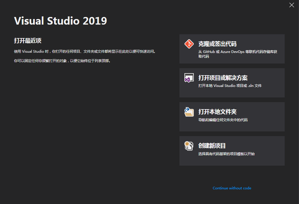 这种新体验旨在与今天的Git存储库一起使用 - 无论是本地存储库还是GitHub,Azure Repos或其他地方的在线Git存储库。 您还可以打开现有项目或解决方案或创建新项目或解决方案。 该窗口还显示最近的项目列表。 “不带代码的继续”选项将打开Visual Studio 2019的实例。