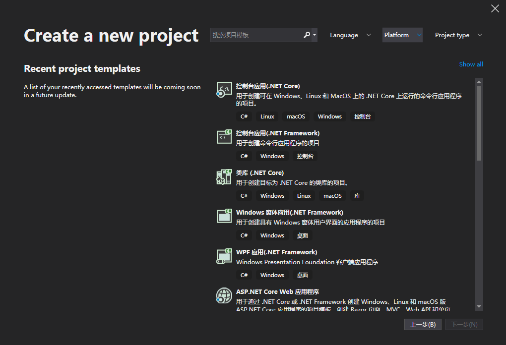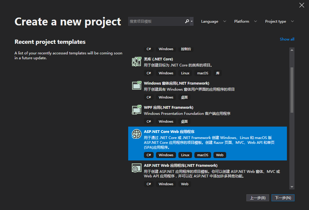 如您所见,已根据流行度列出已安装的项目模板。 页面顶部有3个下拉菜单,用于选择语言,平台和项目类型。 这是一个很好的功能,因为它有助于找到正确的项目模板。 我们来创建一个ASP.NET Core 3.0应用程序。 为此,请选择ASP.NET Core Web应用程序模板,然后单击“下一步”。