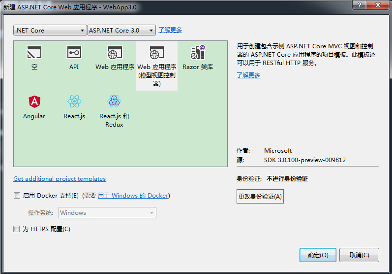 系统将提示您熟悉以下对话框,您需要在其中选择项目模板。 您可能会在对话框中看到一条警告,指出“此版本的Visual Studio不支持ASP.NET Core 3.0或更新的项目”。