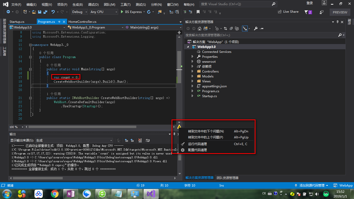 Visual Studio 2019还有一个很好的功能,即文档健康和代码清理。 您可以使用此新命令通过单击按钮来识别并修复警告和建议。