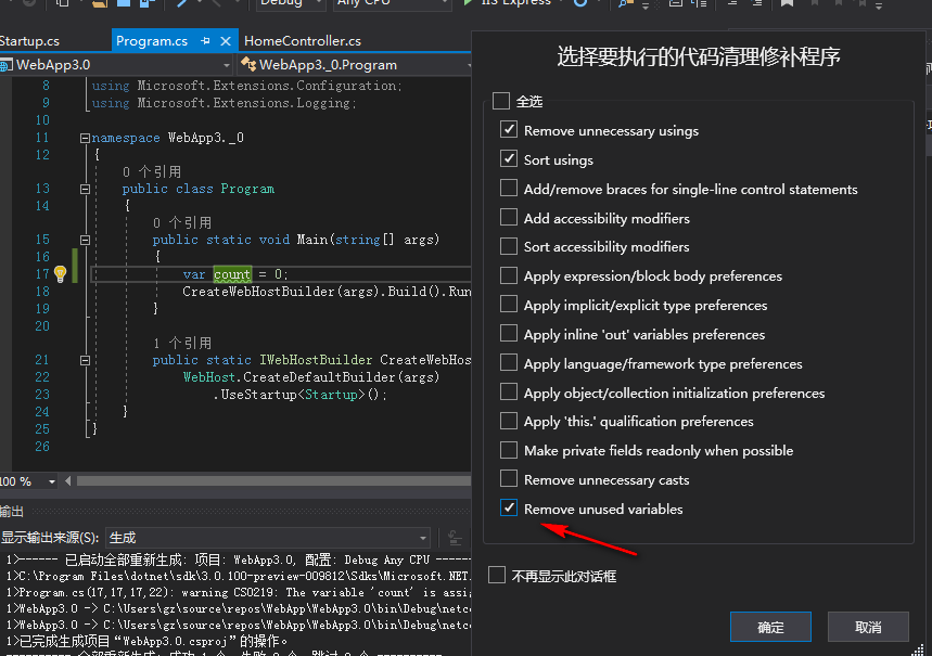 选择“运行代码清理”,如下界面,当然了,你也可以选择“配置代码清理”,这个功能很好,至少可以帮助你写出更好的代码。