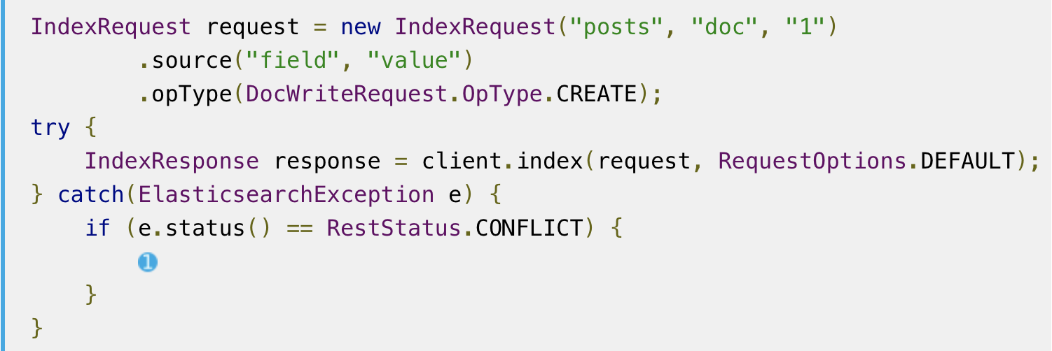 同样的异常也有可能发生在当opType设置为create的时候,且相同索引、相同类型、相同ID的文档已经存在时。例如: