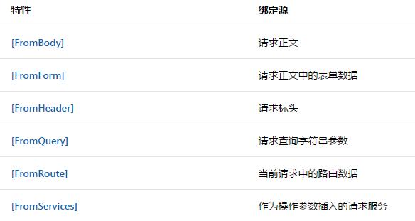 ASP.NET Core 的绑定特性似乎比 ASP.NET 多了一些,下面是官网给的: