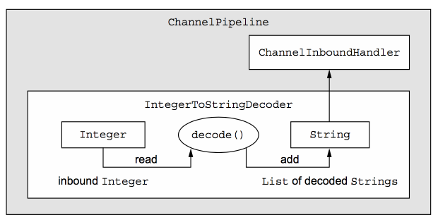 ChannelPipieline ch=.... ch.addLast(new ToIntegerDecoder()); ch.addLast(new IntegerToStringDecoder());