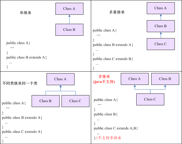 修饰符 class SubClass extends SuperClass{ //类定义部分 }需要注意的是 Java 不支持多继承,但支持多重继承。