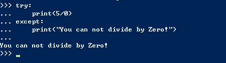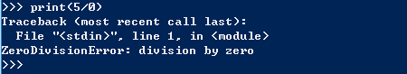 Give me two numbers, and I'll divide them.Enter 'q' to quit. First number: 5Second number: 0Traceback (most recent call last): File "division.py", line 9, in <module> answer = int(first_number) / int(second_number) ZeroDivisionError: division by zero