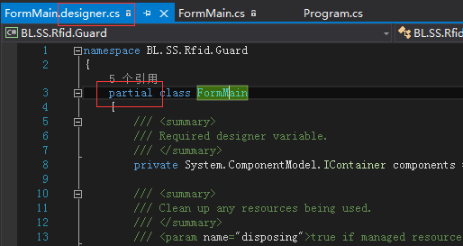 使用部分类的一个典型就是Winform窗体。一些初学者可能还不知道Form窗体使用了部分类。一个Form窗体就有两个cs代码文件,designer.cs就是由界面设计工具生成的:
