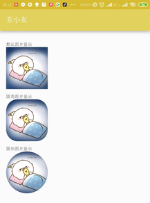 1 //图片地址 2 String urlx="https://timgsa.baidu.com/timg?image&quality=80&size=b9999_10000&sec=1546085784363&di=8ab50ca92e77dcc09ef658b636872f51&imgtype=0&src=http%3A%2F%2Fi0.bbs.fd.zol-img.com.cn%2Ft_s800x5000%2Fg5%2FM00%2F0D%2F05%2FChMkJlnHskGIC8gjAAJBAWB0pxwAAgwNgI_jqMAAkEZ946.jpg"; 3 4 //找到imgview控件 5 main_img1=(ImageView)findViewById(R.id.main_img1); 6 //传递参数,显示图片到控件上 7 ShowImage.displaydDfault(main_img1,urlx); 8 9 main_img2=(ImageView)findViewById(R.id.main_img2);10 ShowImage.displayCutR(main_img2,30,urlx);11 12 13 main_img3=(ImageView)findViewById(R.id.main_img3);14 ShowImage.displayRoundness(main_img3,urlx);