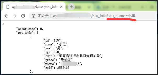 复制粘贴url进入游览器输入栏在url后面加上?隔开然后给参数赋值stu_name=小黑,回车!