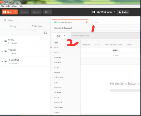通过1.”+”可以添加新的接口连接测试;通过2.可以切换对http的请求方式。