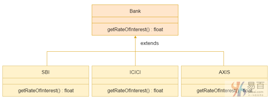 考虑一种情况,Bank类是一个提供获得利率的方法的类。 但是,利率可能因银行而异。 例如,SBI,ICICI和AXIS银行分别提供8.4%,7.3%和9.7%的利率。
