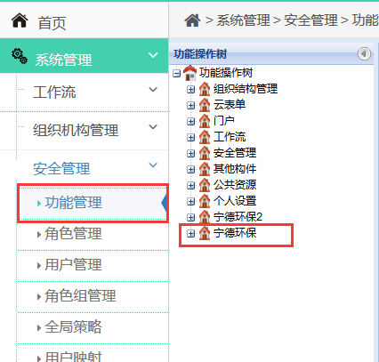 3.如上图,点击到系统管理中的安全管理中的功能管理->选择宁德环保->右键添加模块,填写相应的名称(名称自定义就行)ps:要勾选为末级模块。