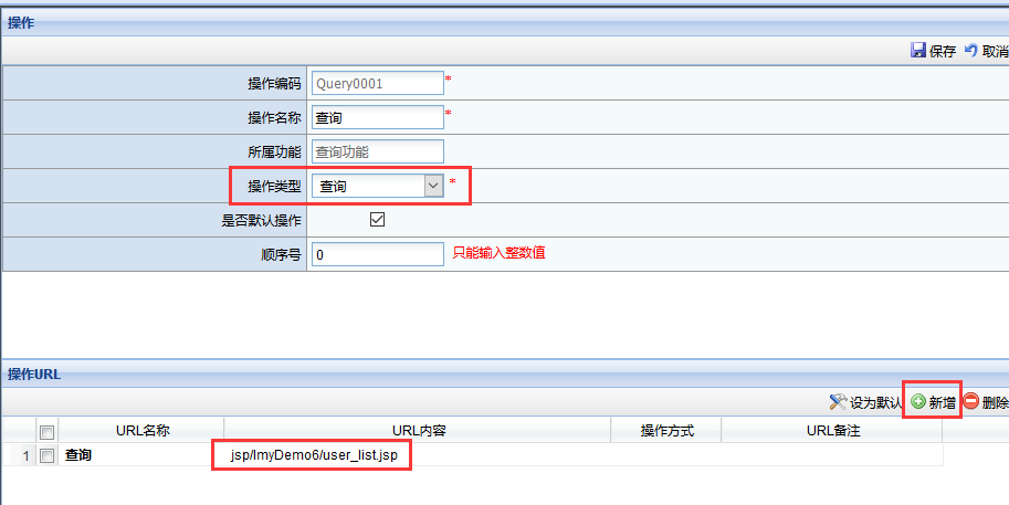 5.如上图,右键点击我们定义好的功能,添加操作,需要勾选默认操作,点击新增操作url,输入我们写好的功能模块的url地址,这里我的地址是jsp/lmyDemo6/user_list.jsp。