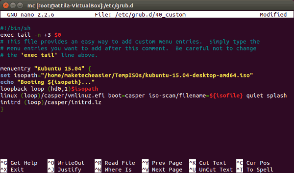 menuentry "Kubuntu 15.04 ISO" {set isofile="/home/maketecheasier/TempISOs/kubuntu-15.04-desktop-amd64.iso"loopback loop (hd0,1)$isofileecho "Starting $isofile..."linux (loop)/casper/vmlinuz.efi boot=casper iso-scan/filename=${isofile} quiet splash