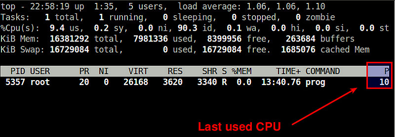 输出表示进程的 PID 为 5357(名为"prog")目前在CPU 内核 10 上运行着。如果该过程没有被固定,PSR 列会根据内核可能调度该进程到不同内核而改变显示。