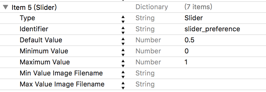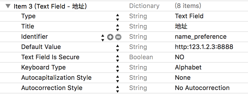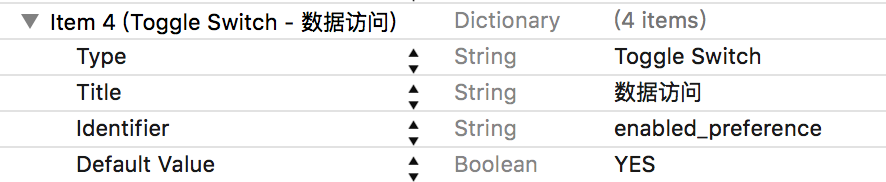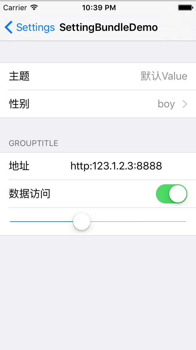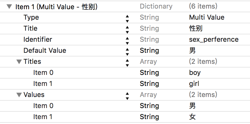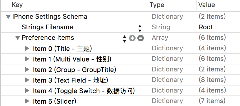 Settings.Bundle支持六种配置项分别是:Title,MultiValue,Group,Slider,ToggleSwitch,TextField 。