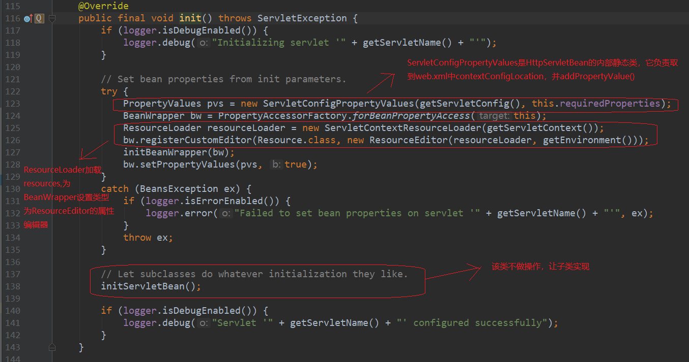 我们从HttpServletBean开始看,HttpServletBean重写了其父类GenericServlet的init方法,我们来看看init到底做了什么(在启动Tomcat的时候会进入init方法)