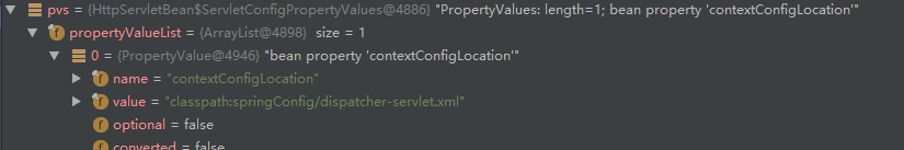 ServletConfigPropertyValues是HttpServletBean的内部静态类,它负责取到web.xml中contextConfigLocation,并addPropertyValue(),在PropertyValues可以看到取到的值