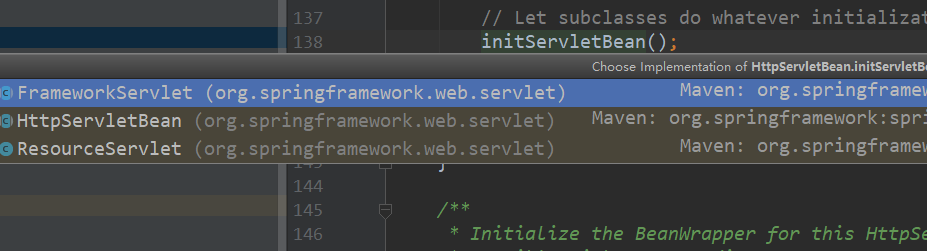 按ctrl+alt+b,看initServletBean()到底在哪里被实现
