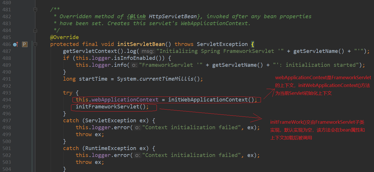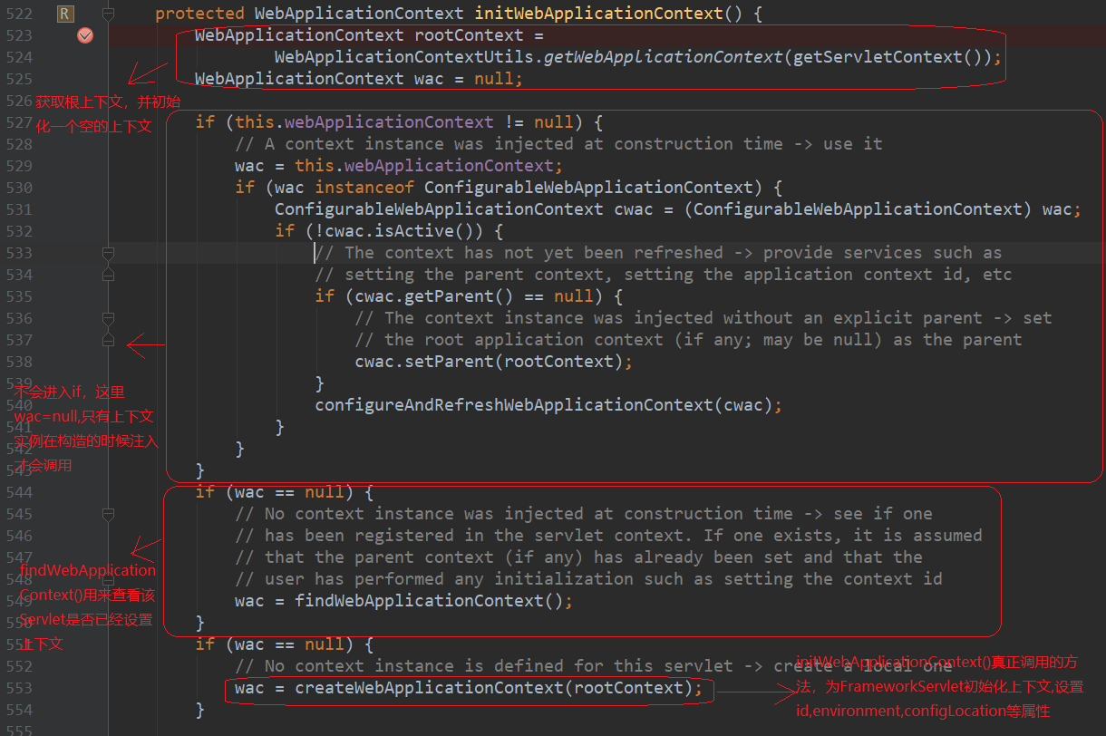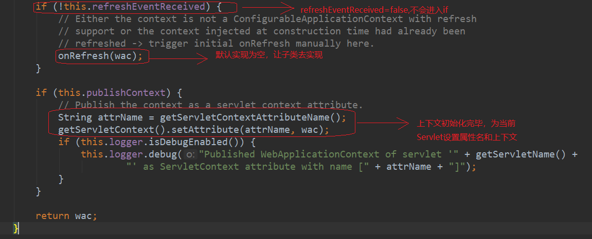 webApplicationContext是FrameworkServlet的上下文,initWebApplicationContext()方法为当前Servlet初始化上下文