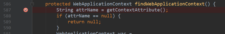 549行调用findWebApplicationContext()方法,这个方法用来查看该Servlet是否已经设置上下文,我们点进去看,没有得到attrName,返回null