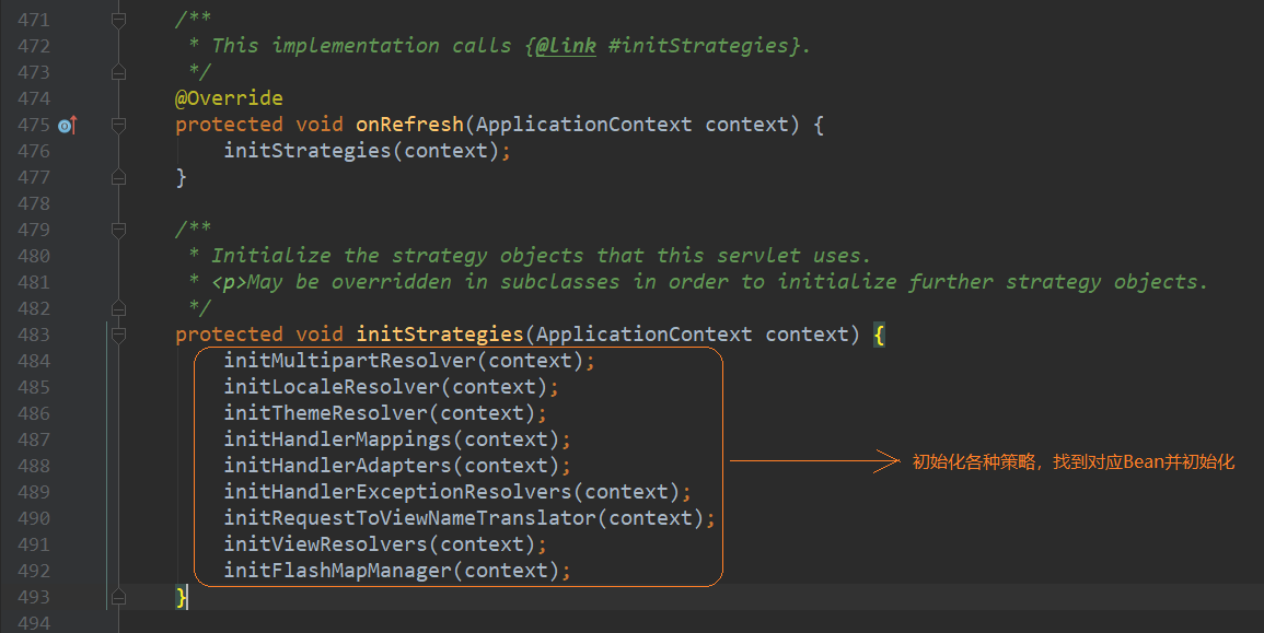 560行onRefresh()是为了防止构造注入上下文的时候没有刷新,去手动刷新,在DispatcherServlet有实现