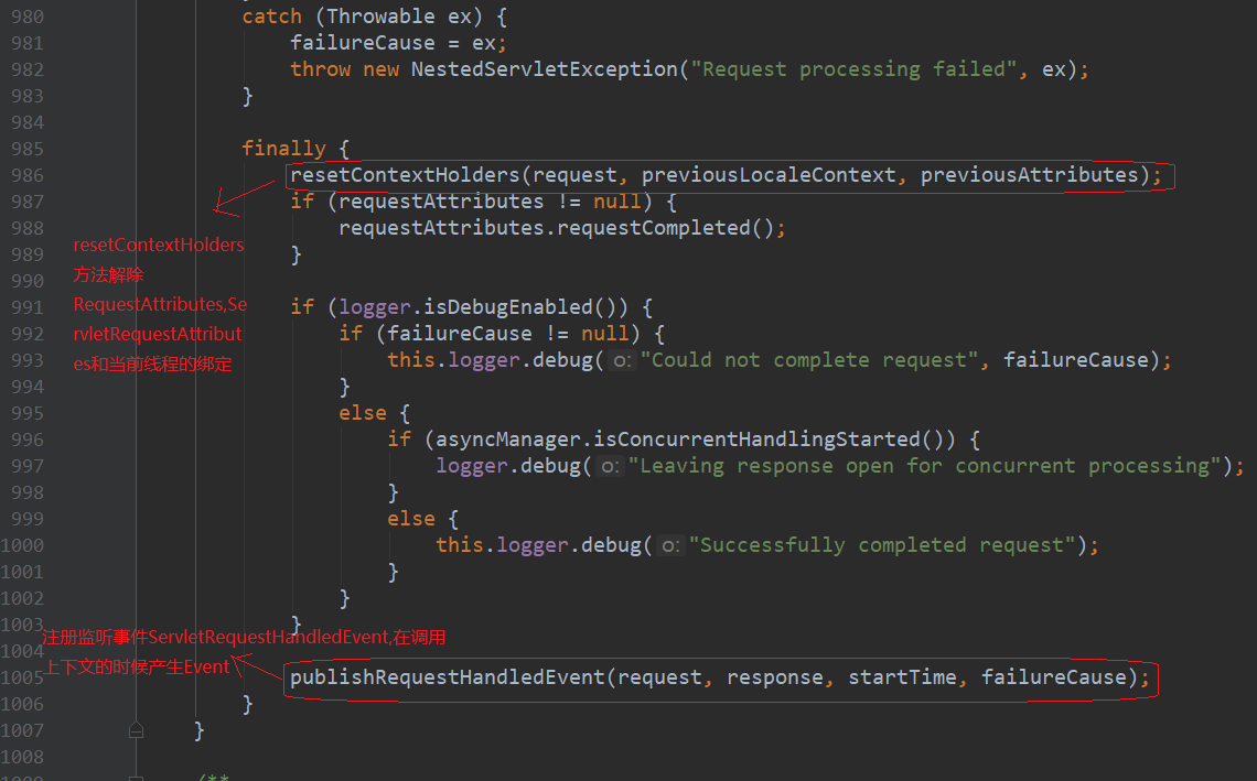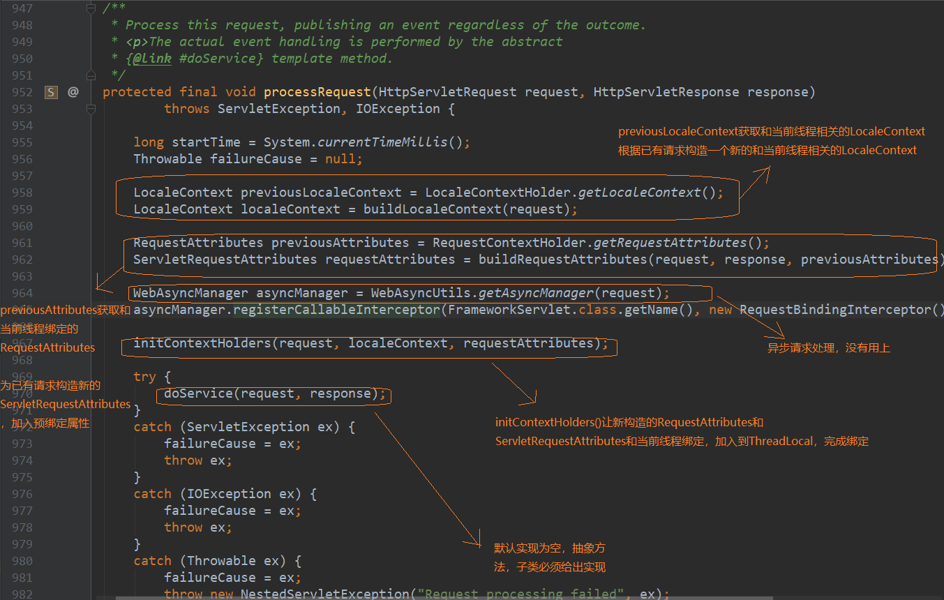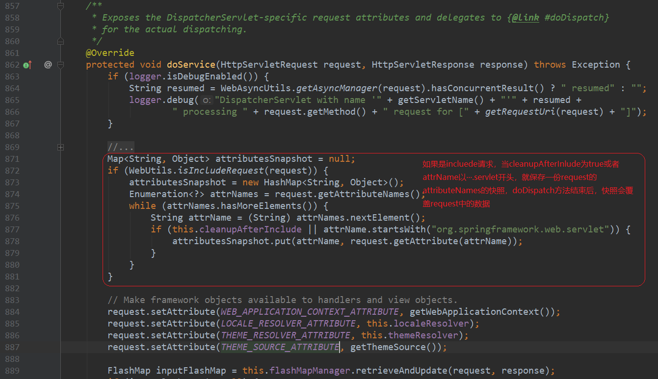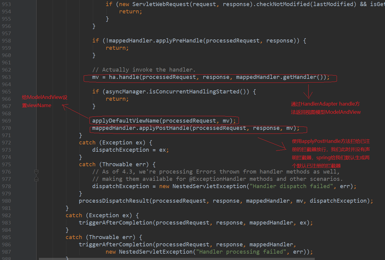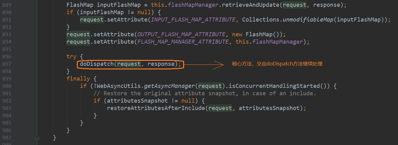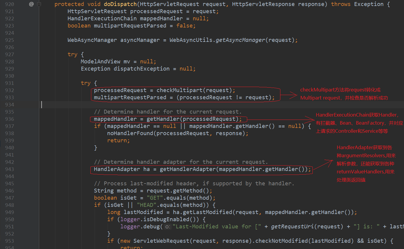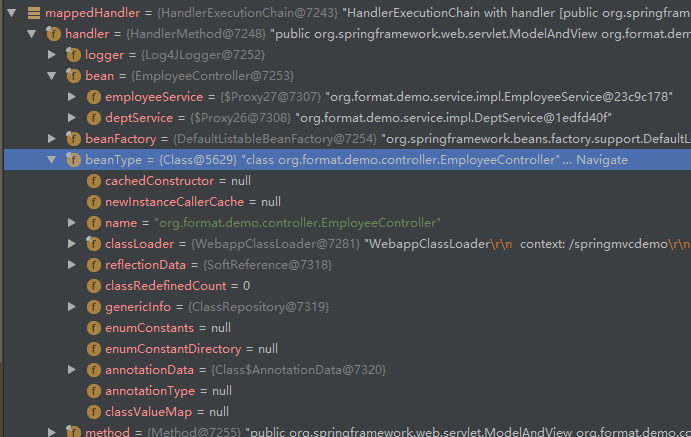 ContextLoader162行指向了ContextLoader.properties,一个配置文件,它指向了org.springframework.web.context.support.Xml 在XmlWebApplicationContext loadBeanDefinitions()获取到了contextConfigLocation,XmlBeanDefinitionReader使用xsd读取xml文件,不再详述,园友可以点进去看看 顺着刚才的思路,我们看看DispatcherServlet,DispatcherServlet重写了父类FrameworkServlet的onRefresh(ApplicationContext contex)方法 总结下HttpServletBean,FrameworkServlet和DispatcherServlet初始化过程 1.HttpServletBean 初始化web.xml中的参数 2.FrameworkServlet 将上下文赋予当前Servlet 3.DispatcherServlet 初始化HandlerMapping(请求映射),HandlerExceptionResolver(异常处理),ViewResolver(视图解析)等功能实现类 在浏览器输入http://localhost:8080/springmvcdemo/employee,触发DispatcherServlet的processRequest方法 我不得不说下其父类FrameworkServlet的processRequest方法 previousLocaleContext获取和当前线程相关的LocaleContext 根据已有请求构造一个新的和当前线程相关的LocaleContext previousAttributes获取和当前线程绑定的RequestAttributes 为已有请求构造新的ServletRequestAttributes,加入预绑定属性 initContextHolders让新构造的RequestAttributes和ServletRequestAttributes和当前线程绑定,加入到ThreadLocal,完成绑定 抽象方法doService由FrameworkServlet子类DispatcherServlet重写 resetContextHolders方法解除RequestAttributes,ServletRequestAttributes和当前线程的绑定 注册监听事件ServletRequestHandledEvent,在调用上下文的时候产生Event 现在我们看下DispatcherServlet的doService方法 attributesSnapshot用来保存request域中的数据,可以叫做“快照” 进入doDispatch方法 接下来我们看一看doDispatch方法,内容很多,我在这做些简述,细节部分后续会逐一分析 932行checkMultipart方法将request转化成Multipart request 936行HandlerExecutionChain获取Handler,有拦截器、Bean、BeanFactory,并对应上请求的Controller和Service等等 943行HandlerAdapter获取到各种argumentResolvers,用来解析参数,还能获取到各种returnValueHandlers,用来处理类返回值(后续会详解) 963行通过HandlerAdapter handle方法返回视图模型ModelAndView 969行给ModelAndView设置viewName 970行使用applyPostHandle方法拦给已注册的拦截器放行,我们此时并没有声明拦截器,spring给我们默认生成两个默认已注册的拦截器,如下 结束,文中难免有错误,希望园友能及时指出 https://docs.spring.io/spring/docs/4.3.7.RELEASE/spring-framework-reference/htmlsingle/#mvc-servlet 本文版权归作者和博客园共有,欢迎转载,但未经作者同意请保留此段声明,请在文章页面明显位置给出原文连接 3.DispatcherServlet处理请求
