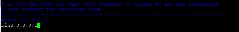 1. 注释掉原来这行,并且把IP改为 0.0.0.0,不改的话只能本机访问redis,外机是无法访问的