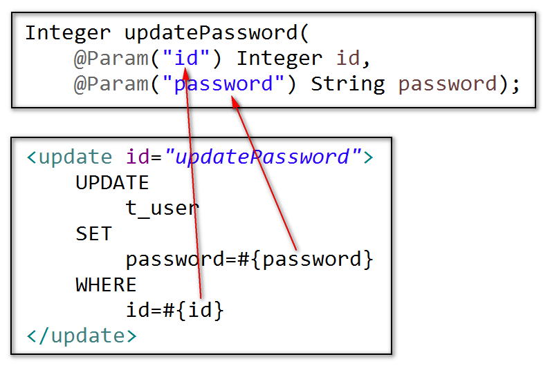 解决方案就是“封装”,例如将以上2个参数id、password封装到1个User对象中,或将这2个参数封装到1个Map对象中……但是,无论哪种做法,都存在调用方法不便利的问题,MyBatis提供的解决方案就是添加注解: