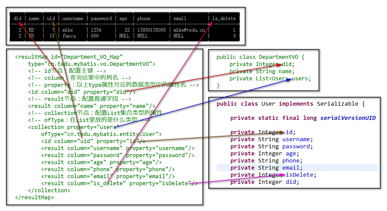 <resultMap id="Department_VO_Map" type="cn.tedu.mybatis.vo.DepartmentVO"> <!-- id节点:配置主键 --> <!-- column:查询结果中的列名 --> <!-- property:以上type属性对应的数据类型中的属性名 --> <id column="did" property="did"/> <!-- result节点:配置普通字段 --> <result column="name" property="name"/> <!-- collection节点:配置List集合类型的属性 --> <!-- ofType:在List里放的是什么类型 --> <collection property="users" ofType="cn.tedu.mybatis.entity.User"> <id column="uid" property="id"/> <result column="username" property="username"/> <result column="password" property="password"/> <result column="age" property="age"/> <result column="phone" property="phone"/> <result column="email" property="email"/> <result column="is_delete" property="isDelete"/> </collection> </resultMap>