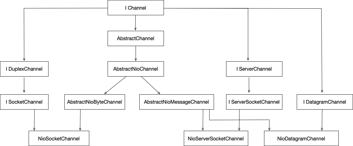NIO实现最终派生出3个类型NioServerSocketChannel实现了tcp server, NioSocketChannel实现了tcp client, NioDatagramChannel实现了udp socket。