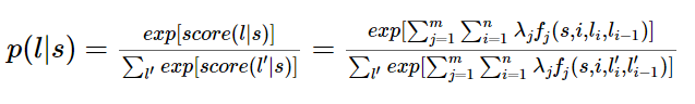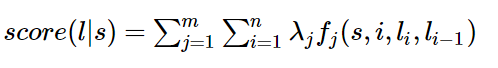 定义好一组特征函数后,我们要给每个特征函数f_j赋予一个权重λ_j。现在,只要有一个句子s,有一个标注序列l,我们就可以利用前面定义的特征函数集来对l评分。