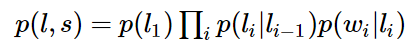 p(l_i|l_i-1)是转移概率,比如,l_i-1是介词,l_i是名词,此时的p表示介词后面的词是名词的概率。
