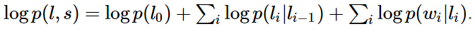 对这个分数进行指数化和标准化,我们就可以得到标注序列l的概率值p(l|s),如下所示: